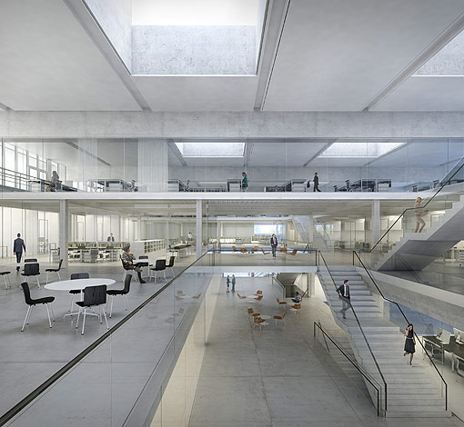 Der grosszügige Eingangsbereich führt in die öffentlichen Räume des Erdgeschosses mit Restaurant, Mikro-Brasserie sowie Auditorien. Eine offene Treppe führt in das neue obere Erdgeschoss und gibt den Blick auf den gesamten Innenraum frei. Die oberen Geschosse sind durch unterschiedliche Mieter besetzt und treten durch visuelle und räumliche Bezüge über die doppel- und dreigeschossigen Freiräume zueinander in Beziehung.
